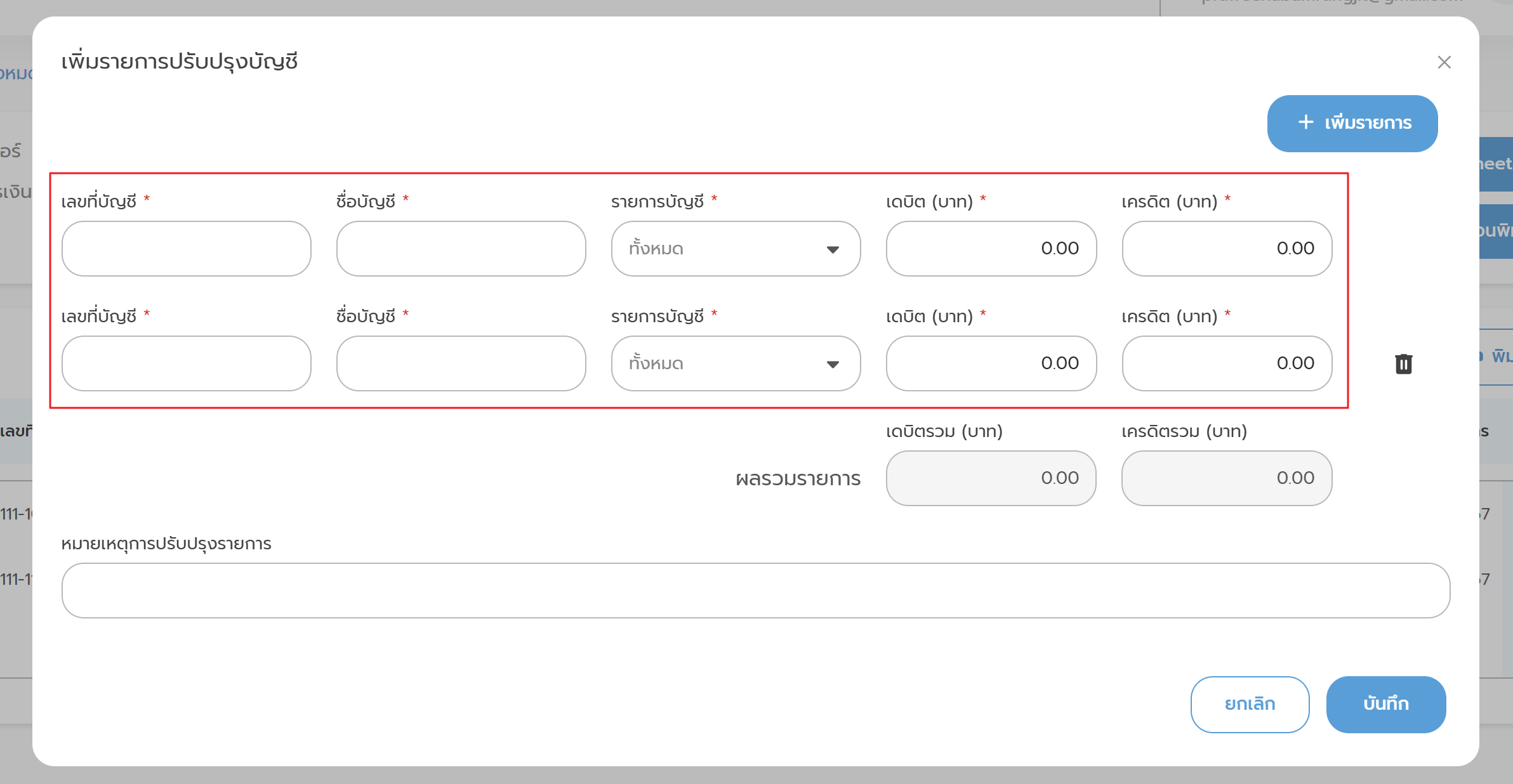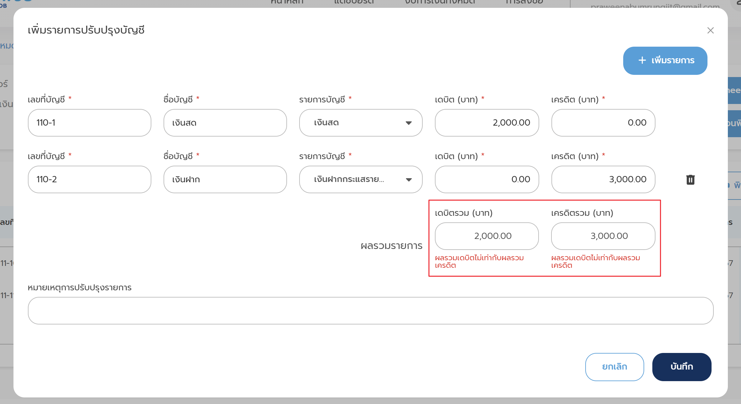 2. กรณี "บันทึก" ข้อมูล ผลรวมเดบิตต้องเท่ากับผลรวมเครดิต
