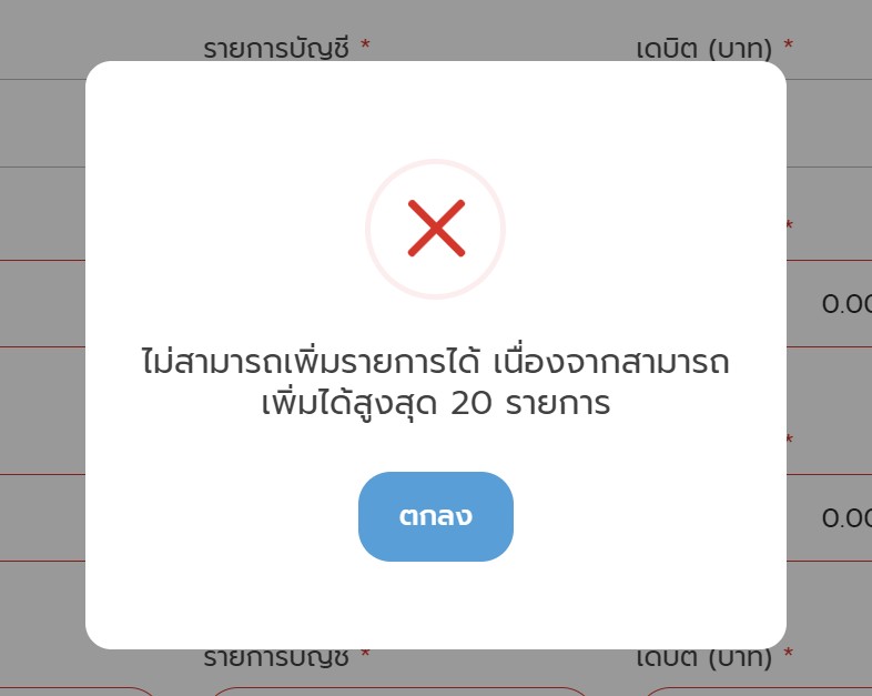 3. กรณีเพิ่มรายการปรับปรุง สามารถเพิ่มได้สูงสุด 20 รายการ ต่อ 1 ชุดข้อมูล เมื่อกรอกข้อมูลเกินระบบจะแสดงหน้าต่าง ดังรูปภาพ