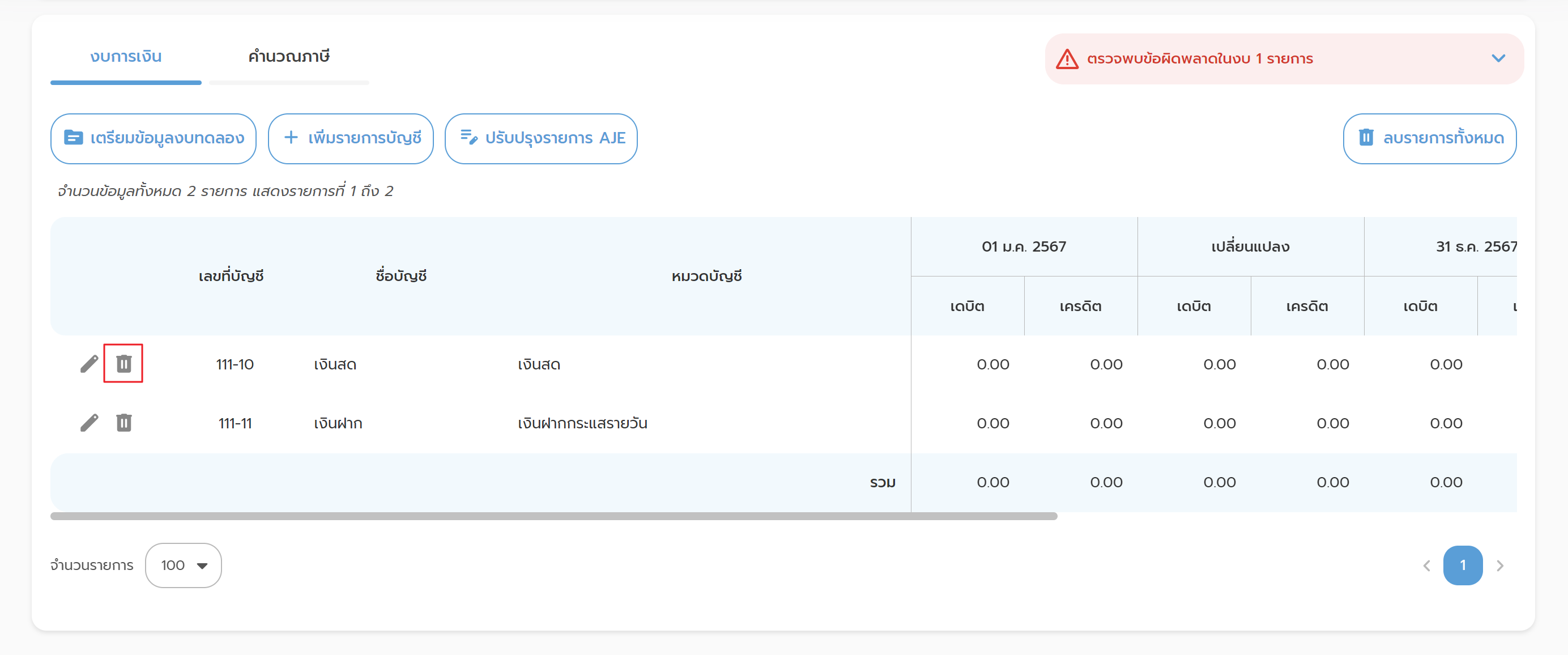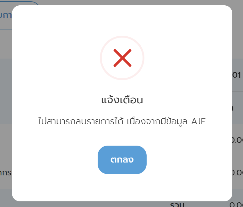 - ถ้าลบข้อมูลงบทดลองที่มีรายการ AJE ระบบจะไม่อนุญาตให้ลบข้อมูล ผู้ใช้งานต้องลบข้อมูลที่หน้าปรับปรุงรายการ AJE ก่อน จึงจะลบรายการที่หน้างบทดลองได้