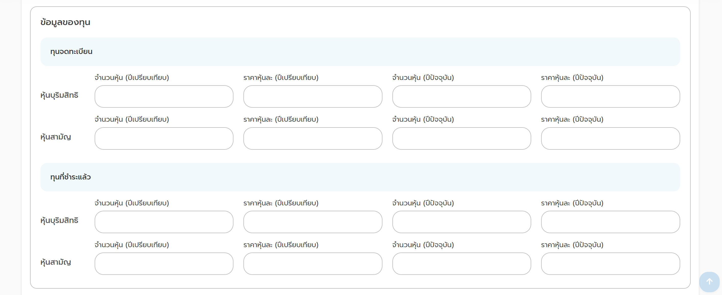 - - กรอกจำนวนหุ้น และ ราคา หุ้น ทั้งปีเปรียบเทียบ และ ปีปัจจุบัน ให้ตรงตาม หนังสือรับรองของกิจการ และ สำเนาบัญชีรายชื่อผู้ถือหุ้น (บอจ.5)
