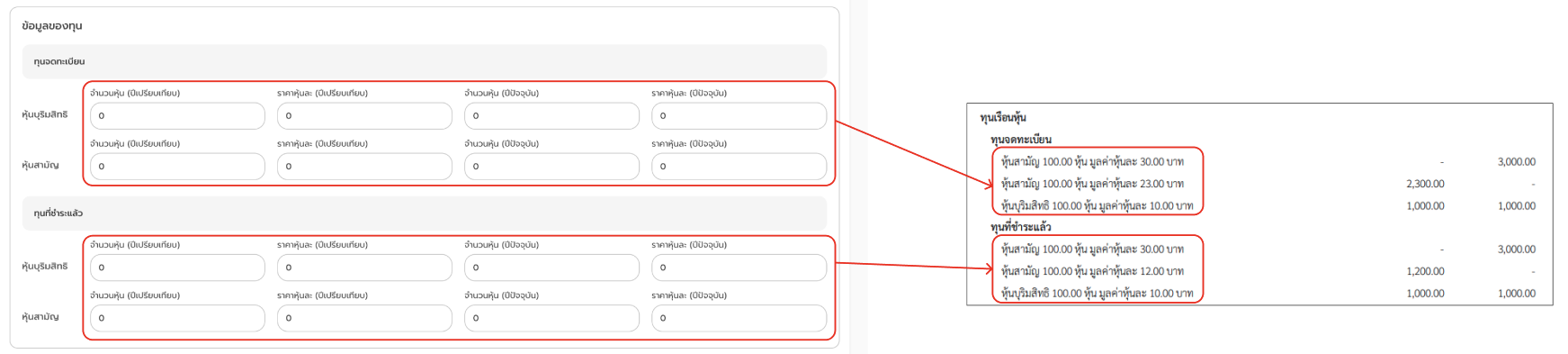 กรณีระบุข้อมูลทุนในปีเปรียบเทียบและปีปัจจุบัน มีจำนวนหุ้นและราคาหุ้นไม่เท่ากัน ข้อมูลจะแสดงแยกบรรทัดกัน