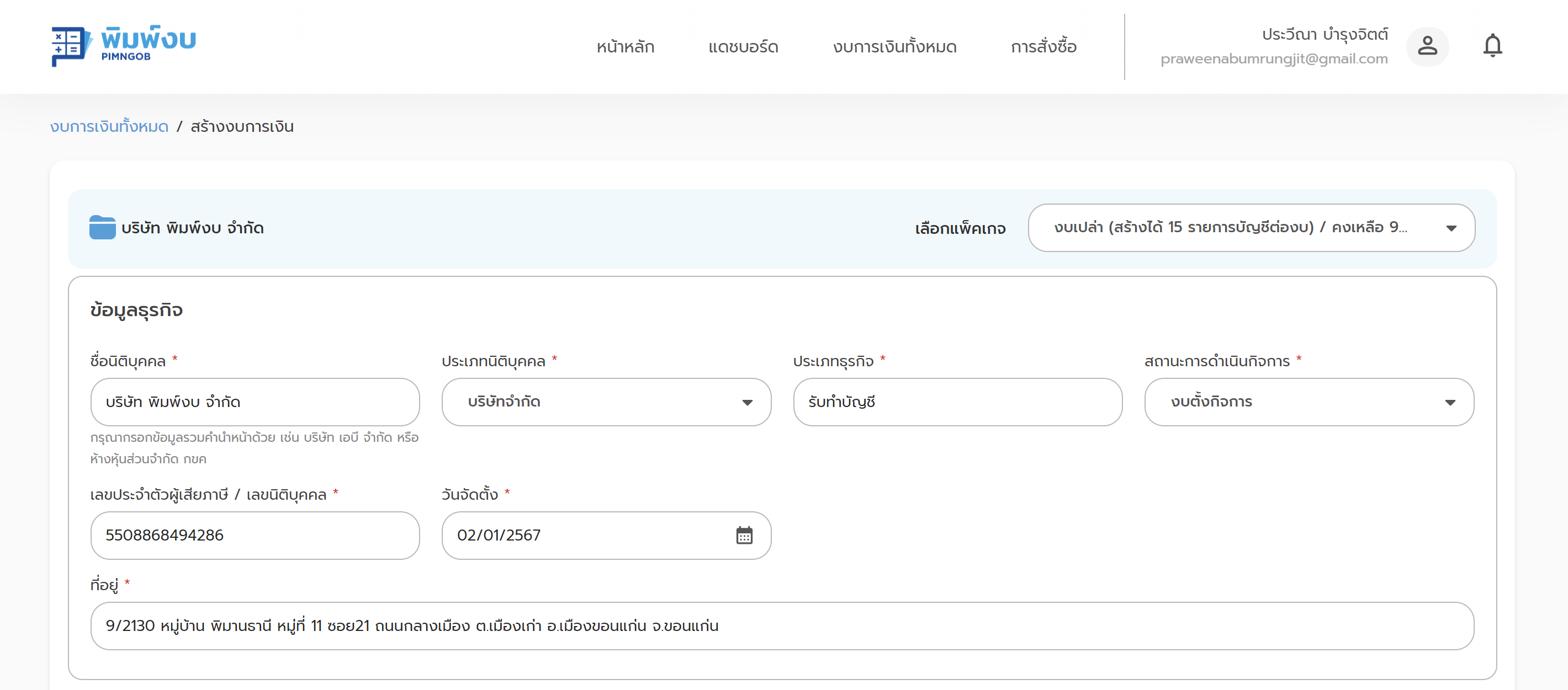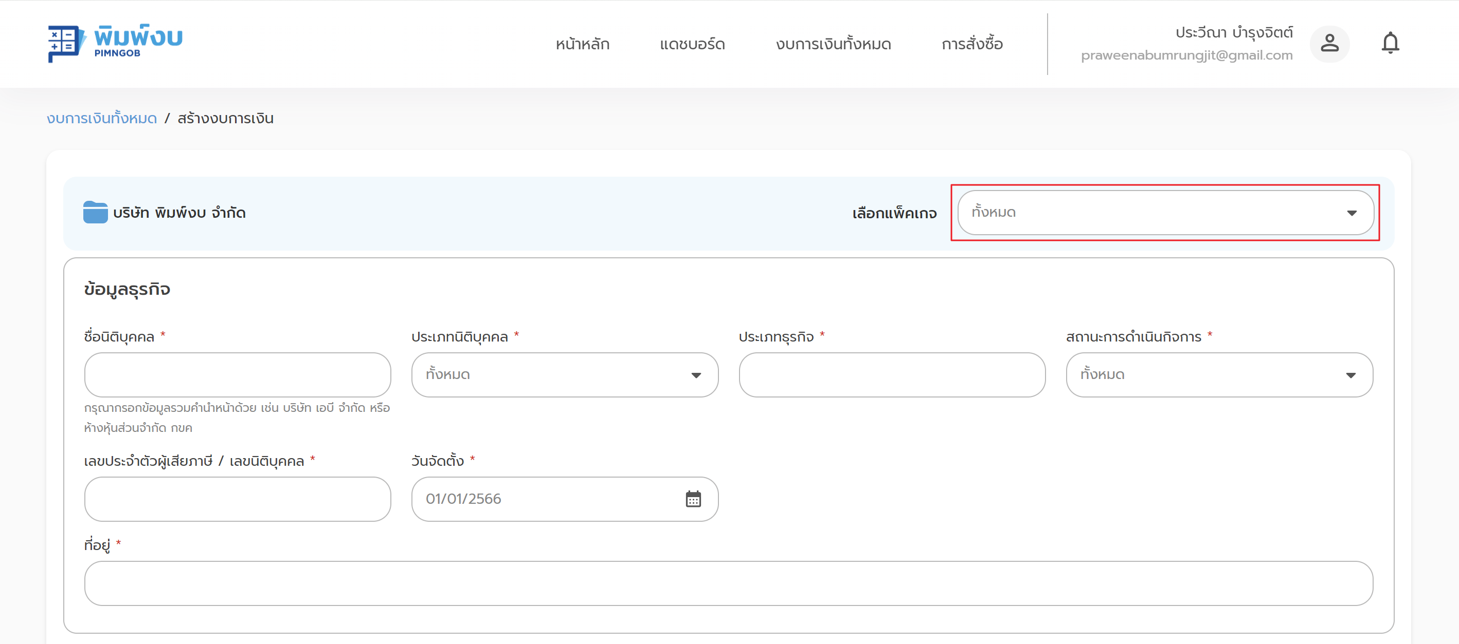 - เลือกข้อมูลแพ็คเกจที่ได้ซื้อไว้ เพื่อสร้างงบการเงิน