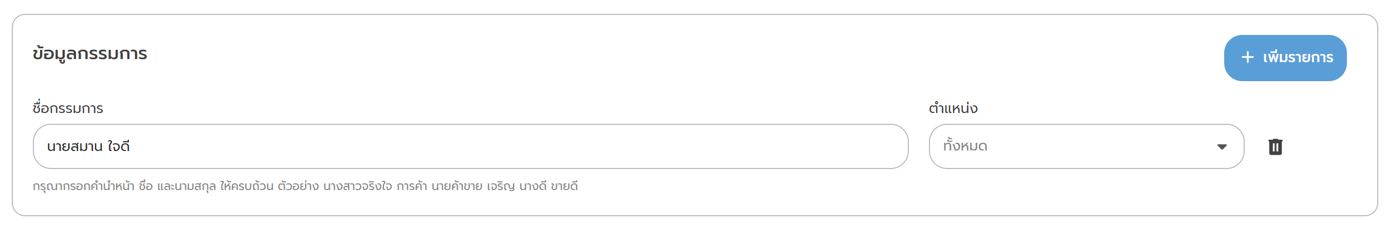 6.1 กรอกข้อมูล "ชื่อกรรมการ" (โดยระบุ "คำนำหน้า" ตามด้วยชื่อ และ นามสกุล ให้ครบถ้วน เช่น นายใจดี ขยันทำงาน)