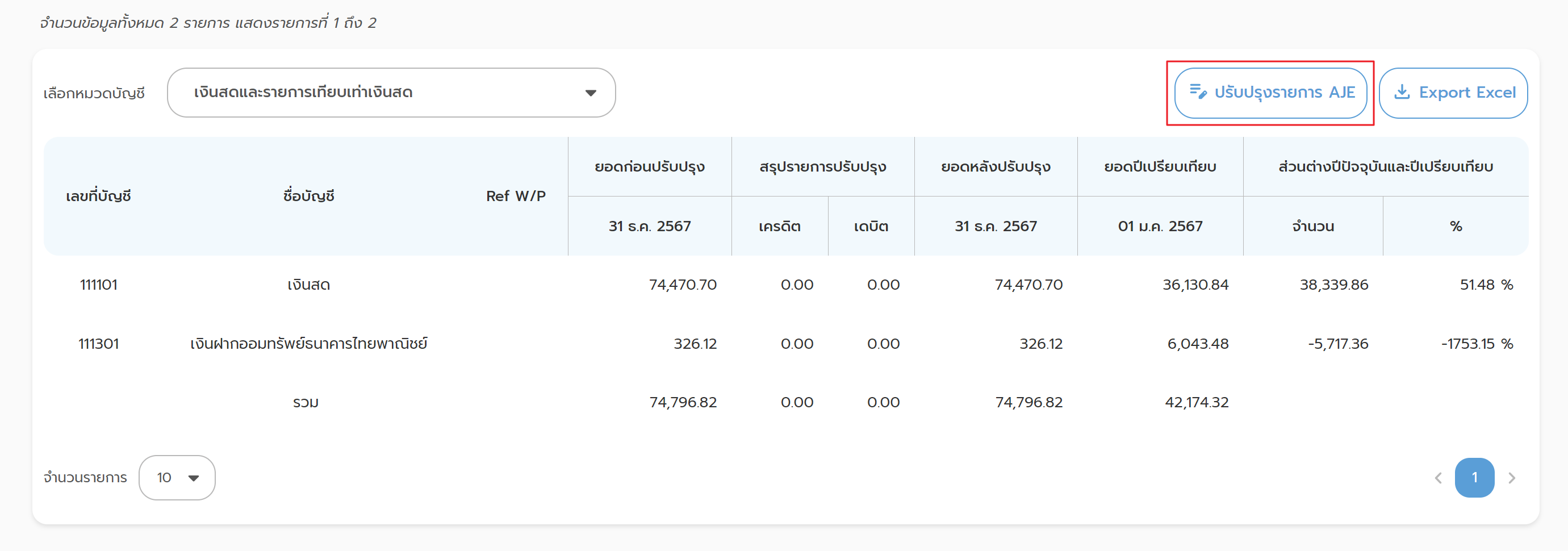 1. กรณีที่ผู้ใช้งานต้องการแก้ไขปรับปรุงรายการ (AJE) สามารถคลิกที่ปุ่ม "ปรับปรุงรายการ AJE" เพื่อไปแก้ไขรายการได้