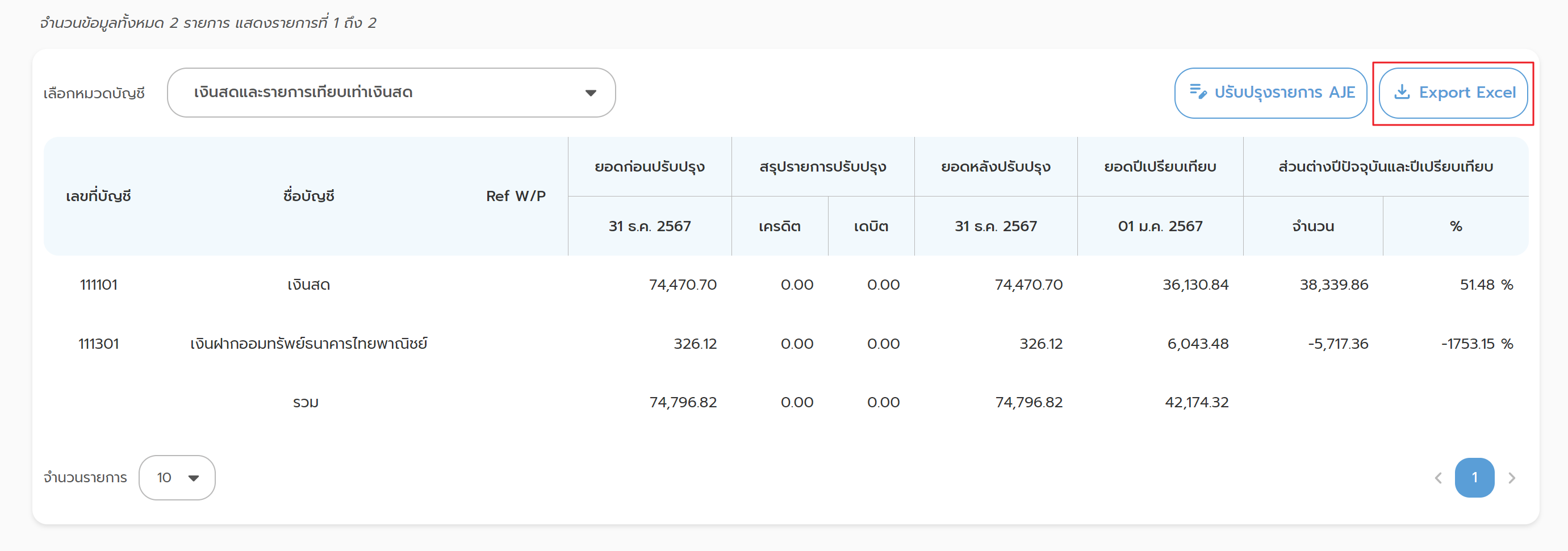 2. รวมถึงสามารถดึงข้อมูลจากระบบ โดยคลิกที่ปุ่ม "Export Excel" ผู้ใช้งานสามารถเปิดดูข้อมูลได้โดยจะเห็นเฉพาะข้อมูลหมวดบัญชีที่มีรายการเท่านั้น