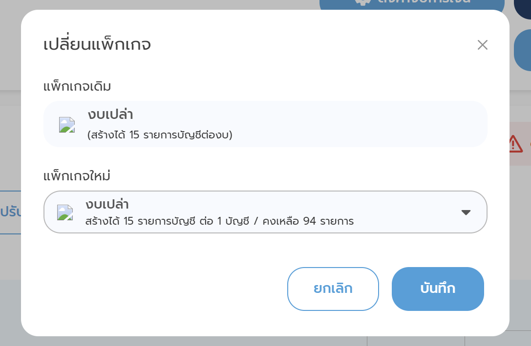 - แก้ไขแพ็กเกจ คือ ส่วนที่แสดงข้อมูลแพ็กเกจกรณีที่ผู้ใช้งานมีแพ็กเกจในการสร้างบการเงินไม่ถึง ระบบจะแสดงหน้าต่าง และให้ผู้ใช้งานทำการเลือกแพ็กเกจใหม่และทำการซื้ออีกครั้งเพื่อทำงบการเงินต่อ