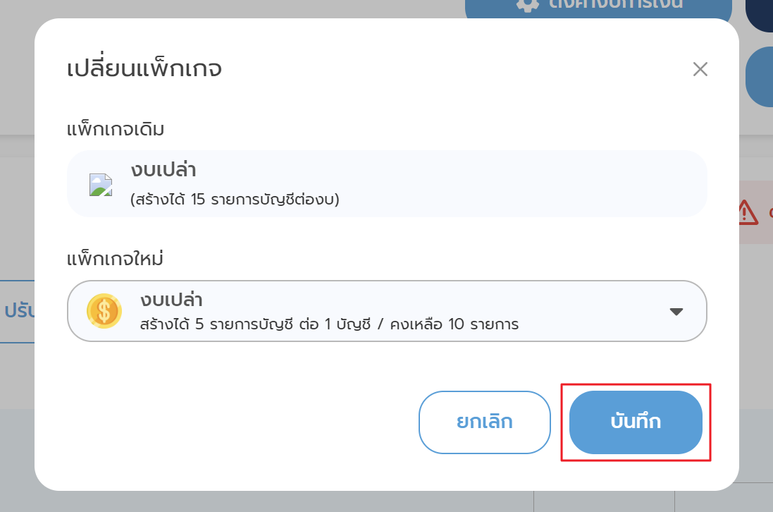 5. ผู้ใช้งานทำการเลือกแพ็กเกจใหม่ จากนั้นคลิกที่ปุ่ม "บันทึก"